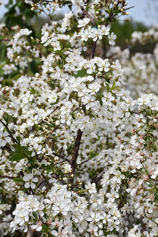 Hardiness Zone: 2a Description: An exciting new development, this hybrid is prized for its tart nearly-black cherries in summer, excellent for jams and pies, as well as showy white flowers in spring; upright and rounded, the hardiest sour (pie) cherry yet Edible Qualities Carmine Jewel Cherry is a medium-sized shrub that is typically grown for its edible qualities. It produces crimson round fruit (technically 'drupes') with hints of deep purple and red flesh which are usually ready for picking in mid summer. Note that the fruits have hard inedible pits inside which must be removed before eating or processing. The fruits have a tart taste. The fruit are most often used in the following ways: Features & Attributes Carmine Jewel Cherry is draped in stunning clusters of fragrant white flowers along the branches in mid spring before the leaves. It has dark green deciduous foliage. The pointy leaves turn an outstanding yellow in the fall. The fruits are showy crimson drupes with hints of deep purple, which are carried in abundance in mid summer. The fruit can be messy if allowed to drop on the lawn or walkways, and may require occasional clean-up. This is a multi-stemmed deciduous shrub with a more or less rounded form. Its average texture blends into the landscape, but can be balanced by one or two finer or coarser trees or shrubs for an effective composition. This plant will require occasional maintenance and upkeep, and is best pruned in late winter once the threat of extreme cold has passed. It is a good choice for attracting birds to your yard. It has no significant negative characteristics. Aside from its primary use as an edible, Carmine Jewel Cherry is sutiable for the following landscape applications; Planting & Growing Carmine Jewel Cherry will grow to be about 6 feet tall at maturity, with a spread of 6 feet. It has a low canopy with a typical clearance of 1 foot from the ground, and is suitable for planting under power lines. It grows at a medium rate, and under ideal conditions can be expected to live for approximately 30 years. This is a self-pollinating variety, so it doesn't require a second plant nearby to set fruit. This shrub is typically grown in a designated area of the yard because of its mature size and spread. It should only be grown in full sunlight. It does best in average to evenly moist conditions, but will not tolerate standing water. It is not particular as to soil type or pH. It is highly tolerant of urban pollution and will even thrive in inner city environments. This particular variety is an interspecific hybrid.