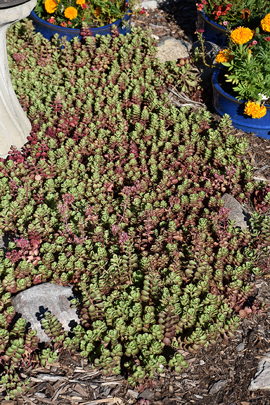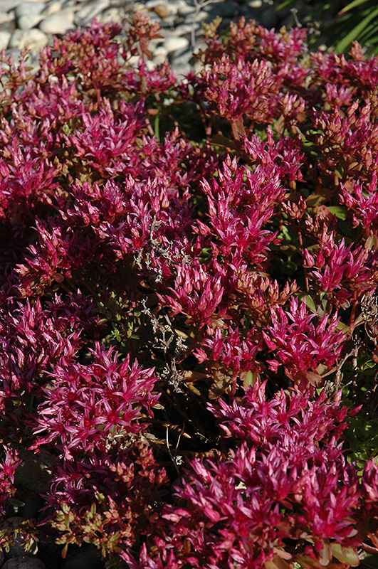 Hardiness Zone: 2a Other Names: Two Row Stonecrop Description: A vigorous perennial groundcover with small succulent foliage which emerges colorful shades of red, eventually fading to dark green; flowers a sea of deep cherry red in summer, spreads rapidly to form a dense low mat; needs a dry and sunny location Ornamental Features Dragon's Blood Stonecrop is smothered in stunning rose star-shaped flowers at the ends of the stems from early to mid summer. Its attractive tiny succulent round leaves emerge burgundy in spring, turning dark green in colour with distinctive dark red edges. As an added bonus, the foliage turns a gorgeous dark red in the fall. Landscape Attributes Dragon's Blood Stonecrop is a dense herbaceous perennial with a ground-hugging habit of growth. It brings an extremely fine and delicate texture to the garden composition and should be used to full effect. This plant will require occasional maintenance and upkeep, and is best cleaned up in early spring before it resumes active growth for the season. Deer don't particularly care for this plant and will usually leave it alone in favor of tastier treats. Gardeners should be aware of the following characteristic(s) that may warrant special consideration; Dragon's Blood Stonecrop is recommended for the following landscape applications; Planting & Growing Dragon's Blood Stonecrop will grow to be only 4 inches tall at maturity, with a spread of 18 inches. When grown in masses or used as a bedding plant, individual plants should be spaced approximately 14 inches apart. Its foliage tends to remain low and dense right to the ground. It grows at a fast rate, and under ideal conditions can be expected to live for approximately 10 years. As an herbaceous perennial, this plant will usually die back to the crown each winter, and will regrow from the base each spring. Be careful not to disturb the crown in late winter when it may not be readily seen! This plant does best in full sun to partial shade. It prefers dry to average moisture levels with very well-drained soil, and will often die in standing water. It is considered to be drought-tolerant, and thus makes an ideal choice for a low-water garden or xeriscape application. It is not particular as to soil pH, but grows best in poor soils, and is able to handle environmental salt. It is highly tolerant of urban pollution and will even thrive in inner city environments. This species is not originally from North America. It can be propagated by division. Dragon's Blood Stonecrop is a fine choice for the garden, but it is also a good selection for planting in outdoor pots and containers. Because of its spreading habit of growth, it is ideally suited for use as a 'spiller' in the 'spiller-thriller-filler' container combination; plant it near the edges where it can spill gracefully over the pot. Note that when growing plants in outdoor containers and baskets, they may require more frequent waterings than they would in the yard or garden. Be aware that in our climate, most plants cannot be expected to survive the winter if left in containers outdoors, and this plant is no exception. Contact our experts for more information on how to protect it over the winter months.