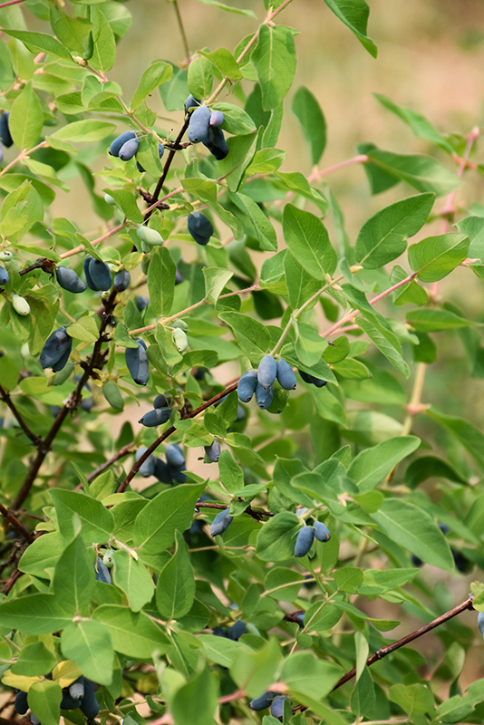Hardiness Zone: 2b Other Names: Honeyberry; Bearberry Honeysuckle Description: An interesting hardy background or massing shrub with clean foliage and powdery blue berries which are edible; dense and fairly compact growing habit, good for general shrub use where a tough performer is required Edible Qualities Sweetberry Honeysuckle is a medium-sized shrub that is commonly grown for its edible qualities, although it does have ornamental merits as well. It produces blue round berries which are usually ready for picking from late spring to early summer. The berries have a sweet taste. The berries are most often used in the following ways: Features & Attributes Sweetberry Honeysuckle features subtle creamy white flowers along the branches in mid spring. It has green deciduous foliage. The narrow leaves do not develop any appreciable fall colour. It produces blue berries in early summer. This is a dense multi-stemmed deciduous shrub with a more or less rounded form. Its average texture blends into the landscape, but can be balanced by one or two finer or coarser trees or shrubs for an effective composition. This plant will require occasional maintenance and upkeep, and is best pruned in late winter once the threat of extreme cold has passed. It is a good choice for attracting butterflies to your yard. It has no significant negative characteristics. Aside from its primary use as an edible, Sweetberry Honeysuckle is sutiable for the following landscape applications; Planting & Growing Sweetberry Honeysuckle will grow to be about 5 feet tall at maturity, with a spread of 4 feet. It tends to fill out right to the ground and therefore doesn't necessarily require facer plants in front, and is suitable for planting under power lines. It grows at a medium rate, and under ideal conditions can be expected to live for approximately 20 years. While it is considered to be somewhat self-pollinating, it tends to set heavier quantities of fruit with a different variety of the same species growing nearby. This shrub can be integrated into a landscape or flower garden by creative gardeners, but is usually grown in a designated edibles garden. It does best in full sun to partial shade. It does best in average to evenly moist conditions, but will not tolerate standing water. It is not particular as to soil type or pH. It is highly tolerant of urban pollution and will even thrive in inner city environments. This species is not originally from North America.![]()
