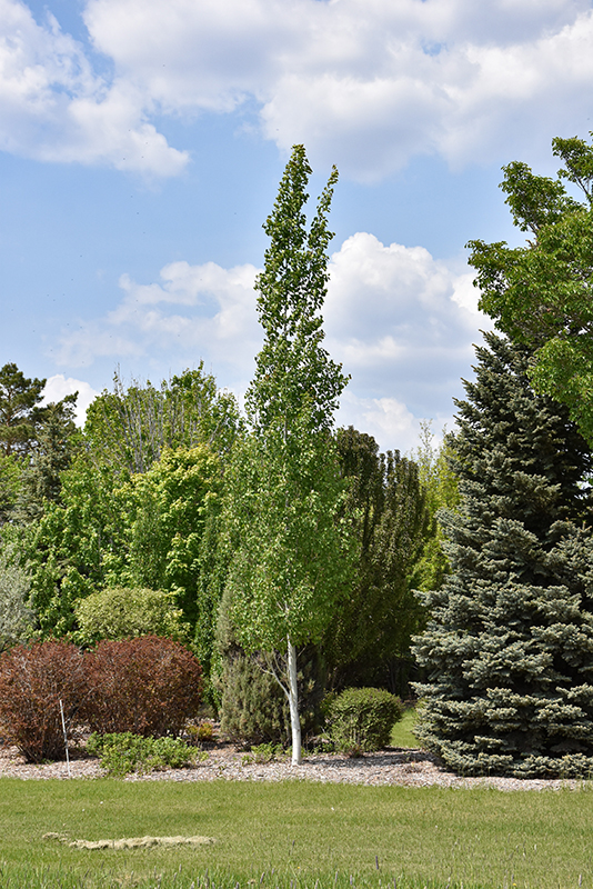 Hardiness Zone: 3a Other Names: Hybrid Poplar, Hybrid Aspen Brand: Jeffries Nurseries Description: A columnar, seedless variety that's fast growing and tolerant of poor growing conditions; possesses a high resistance to Bronze Leaf Disease (BLD); has an aggressive root system, so don't plant near houses; makes a great windbreak or quick shade tree Ornamental Features Guardian™ Columnar Aspen has rich green deciduous foliage on a tree with a columnar habit of growth. The large heart-shaped leaves turn yellow in fall. Landscape Attributes Guardian™ Columnar Aspen is a deciduous tree with a strong central leader and a narrowly upright and columnar growth habit. Its relatively coarse texture can be used to stand it apart from other landscape plants with finer foliage. This tree will require occasional maintenance and upkeep, and is best pruned in late winter once the threat of extreme cold has passed. Gardeners should be aware of the following characteristic(s) that may warrant special consideration; Guardian™ Columnar Aspen is recommended for the following landscape applications; Planting & Growing Guardian™ Columnar Aspen will grow to be about 40 feet tall at maturity, with a spread of 10 feet. It has a low canopy with a typical clearance of 3 feet from the ground, and should not be planted underneath power lines. It grows at a fast rate, and under ideal conditions can be expected to live for 60 years or more. This tree should only be grown in full sunlight. It is an amazingly adaptable plant, tolerating both dry conditions and even some standing water. It is considered to be drought-tolerant, and thus makes an ideal choice for xeriscaping or the moisture-conserving landscape. It is not particular as to soil type or pH, and is able to handle environmental salt. It is highly tolerant of urban pollution and will even thrive in inner city environments. This particular variety is an interspecific hybrid.