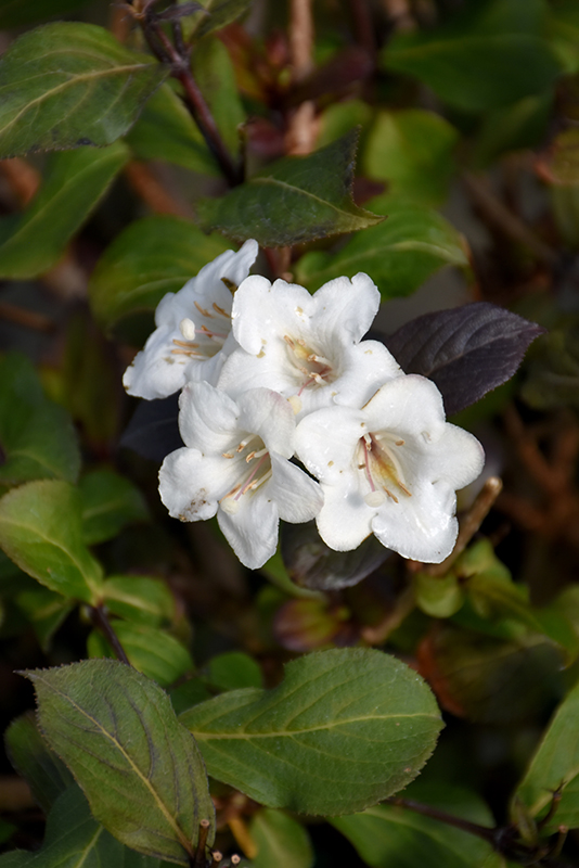 Hardiness Zone: 4a Brand: Proven Winners Description: An elegant selection, featuring green-white trumpet flowers held over dramatic dark foliage in late spring; attracts hummingbirds; a relatively compact shrub, ideal for garden detail use; needs full sun Ornamental Features Wine & Spirits® Weigela features showy clusters of white trumpet-shaped flowers along the branches from late spring to early summer, which emerge from distinctive light green flower buds. It has attractive burgundy-variegated dark green foliage. The pointy leaves are highly ornamental and turn an outstanding deep purple in the fall. The smooth gray bark and dark red branches add an interesting dimension to the landscape. Landscape Attributes Wine & Spirits® Weigela is a multi-stemmed deciduous shrub with an upright spreading habit of growth. Its average texture blends into the landscape, but can be balanced by one or two finer or coarser trees or shrubs for an effective composition. This shrub will require occasional maintenance and upkeep, and should only be pruned after flowering to avoid removing any of the current season's flowers. It is a good choice for attracting hummingbirds to your yard. It has no significant negative characteristics. Wine & Spirits® Weigela is recommended for the following landscape applications; Planting & Growing Wine & Spirits® Weigela will grow to be about 5 feet tall at maturity, with a spread of 5 feet. It tends to fill out right to the ground and therefore doesn't necessarily require facer plants in front, and is suitable for planting under power lines. It grows at a medium rate, and under ideal conditions can be expected to live for approximately 30 years. This shrub should only be grown in full sunlight. It prefers to grow in average to moist conditions, and shouldn't be allowed to dry out. To help this plant achive its best flowering performance, periodically apply a flower-boosting fertilizer from early spring through into the active growing season. It is not particular as to soil type or pH. It is highly tolerant of urban pollution and will even thrive in inner city environments. This is a selected variety of a species not originally from North America. Wine & Spirits® Weigela makes a fine choice for the outdoor landscape, but it is also well-suited for use in outdoor pots and containers. With its upright habit of growth, it is best suited for use as a 'thriller' in the 'spiller-thriller-filler' container combination; plant it near the center of the pot, surrounded by smaller plants and those that spill over the edges. It is even sizeable enough that it can be grown alone in a suitable container. Note that when grown in a container, it may not perform exactly as indicated on the tag - this is to be expected. Also note that when growing plants in outdoor containers and baskets, they may require more frequent waterings than they would in the yard or garden. Be aware that in our climate, most plants cannot be expected to survive the winter if left in containers outdoors, and this plant is no exception. Contact our experts for more information on how to protect it over the winter months.![]()