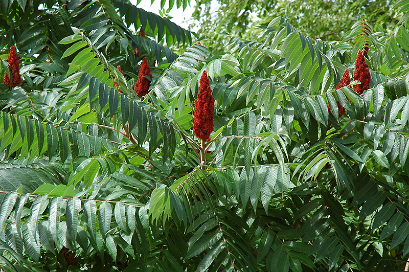 Hardiness Zone: 3b Description: An exotic tall shrub with stout, pithy stems and tropical-looking compound leaves clustered at the ends, quite leggy; showy upright spikes of red-purple fruit lasting into winter and brilliant fall colors; suckers vigorously, ideal for naturalizing Ornamental Features Staghorn Sumac is primarily grown for its highly ornamental fruit. The crimson fruits are carried on showy plumes displayed in abundance from late summer to late winter. It has spikes of yellow flowers rising above the foliage from early to mid summer. It has green deciduous foliage. The large narrow pinnately compound leaves turn an outstanding scarlet in the fall. Landscape Attributes Staghorn Sumac is an open multi-stemmed deciduous shrub with an upright spreading habit of growth. Its relatively fine texture sets it apart from other landscape plants with less refined foliage. This is a high maintenance shrub that will require regular care and upkeep, and is best pruned in late winter once the threat of extreme cold has passed. It is a good choice for attracting butterflies to your yard. Gardeners should be aware of the following characteristic(s) that may warrant special consideration; Staghorn Sumac is recommended for the following landscape applications; Planting & Growing Staghorn Sumac will grow to be about 19 feet tall at maturity, with a spread of 25 feet. It tends to be a little leggy, with a typical clearance of 5 feet from the ground, and is suitable for planting under power lines. It grows at a medium rate, and under ideal conditions can be expected to live for 40 years or more. This shrub does best in full sun to partial shade. It is very adaptable to both dry and moist growing conditions, but will not tolerate any standing water. It is considered to be drought-tolerant, and thus makes an ideal choice for xeriscaping or the moisture-conserving landscape. It is not particular as to soil type or pH. It is highly tolerant of urban pollution and will even thrive in inner city environments. This species is native to parts of North America.